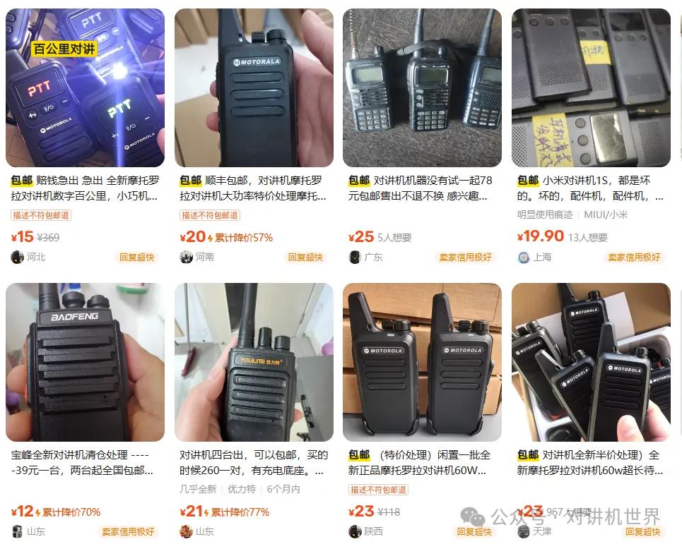 整个对讲机行业欣欣向荣,但是也确实面临了一些问题。比如对讲机毫无底线的价格战。你可以在从某宝上买到一个13元的对讲机(包邮),也可以再某鱼上买到不到100元的“摩托罗拉”对讲机,甚至很多从生产厂家到销售渠道打出了终身免费、通信功率100W、通联距离超10公里的口号吸引用户购买。这些无疑都在不断地消耗着整个行业的口碑与信任。
